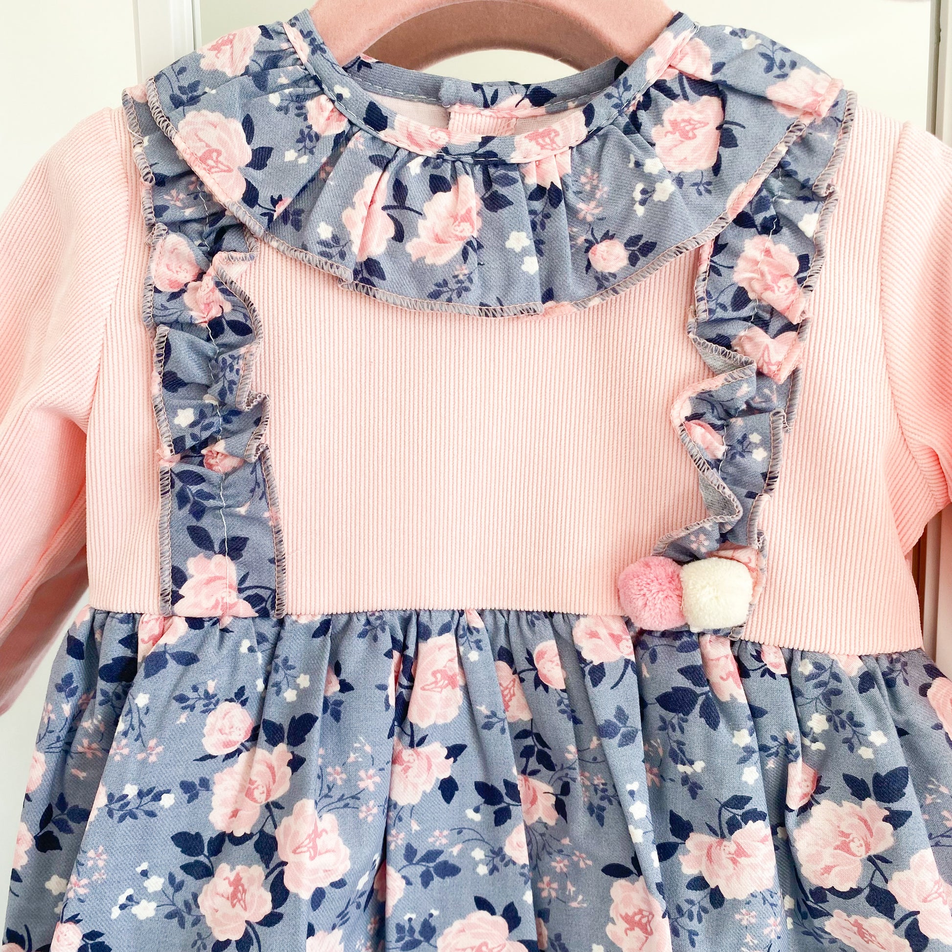Pretty baby pink and blue floral dress. Dress is corduroy like material at the top, and eye-catching floral print at the bottom.
