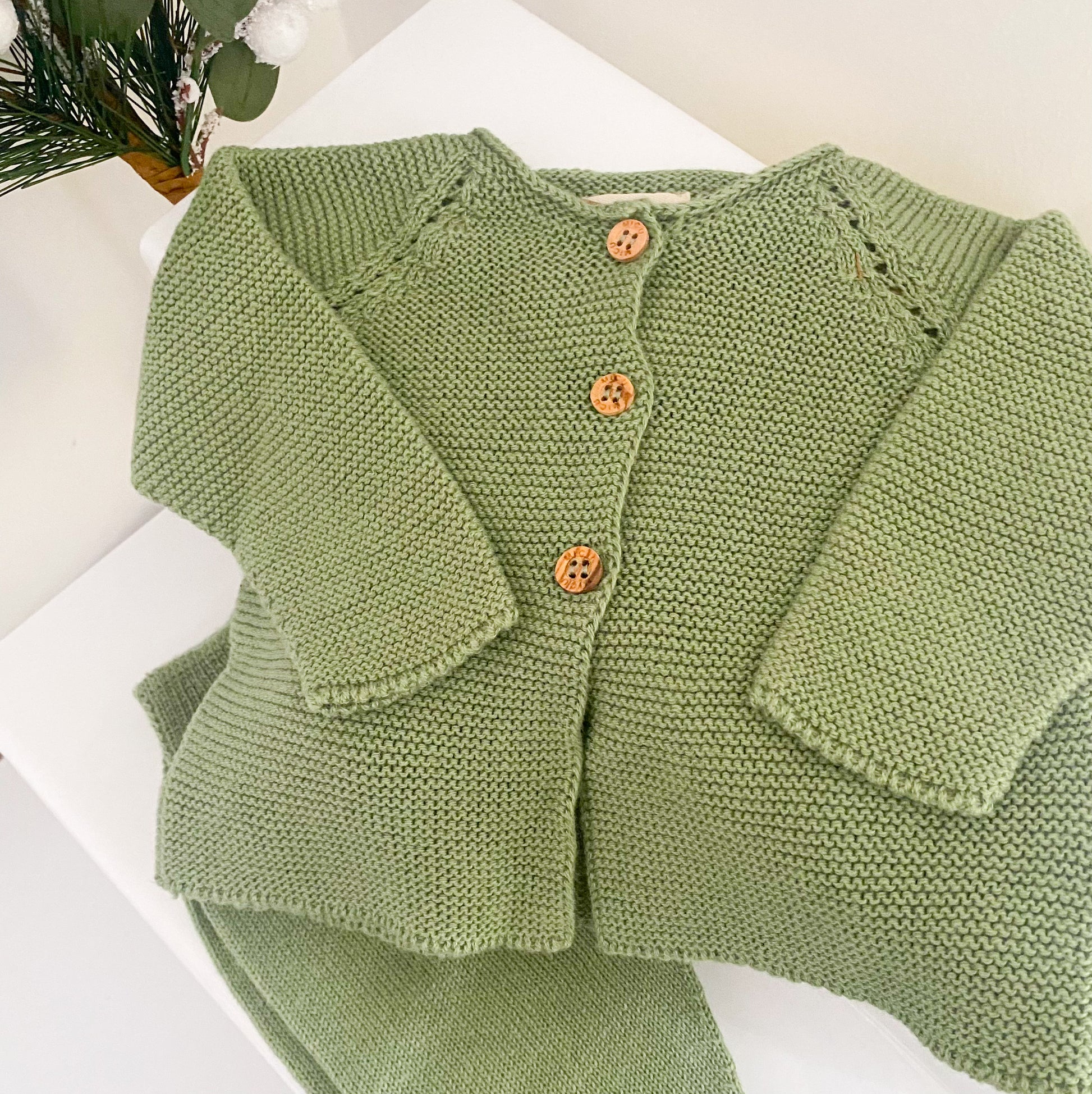It has wooden buttons on the jacket and is made without any internal seams, helping to avoid any irritation to baby.