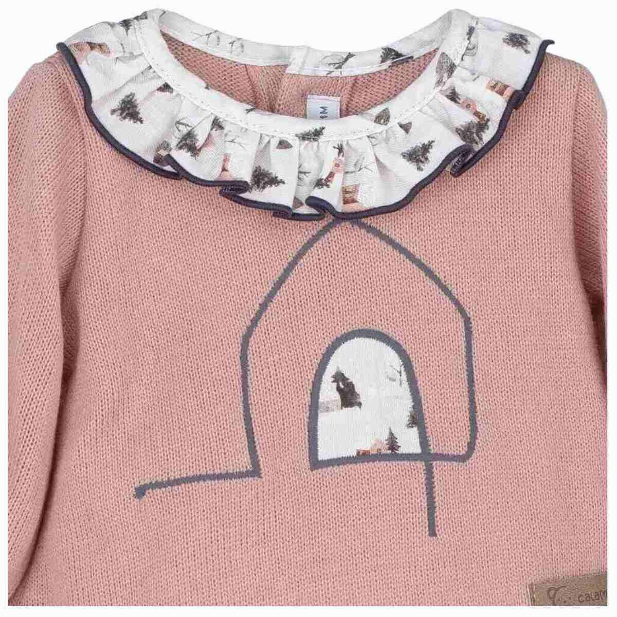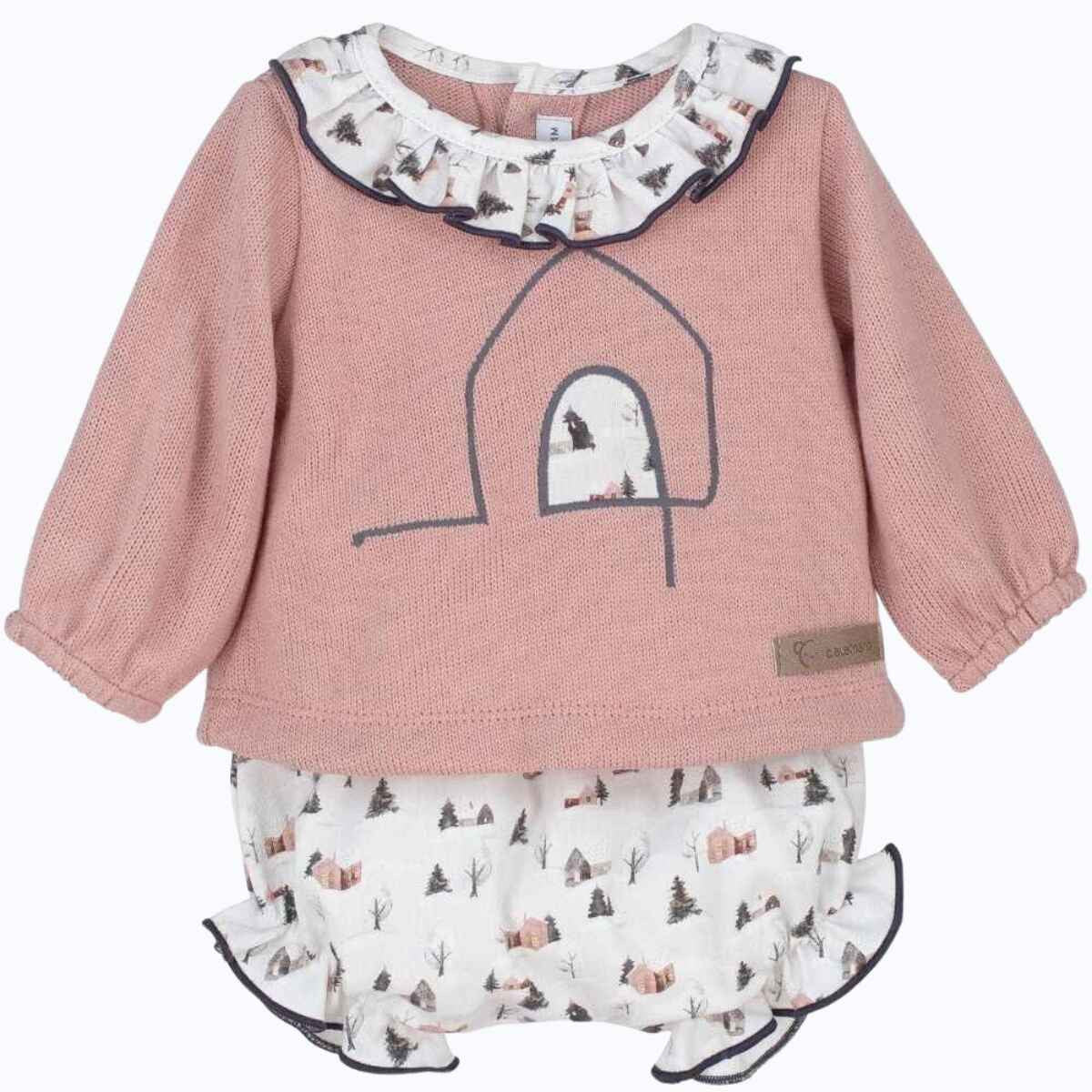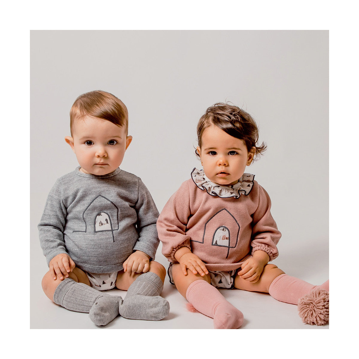 Long sleeve blouse with a tiny house outline design infront. Frilled printed neckline and printed pants. An adorable and comfortable outfit for a any occasion.