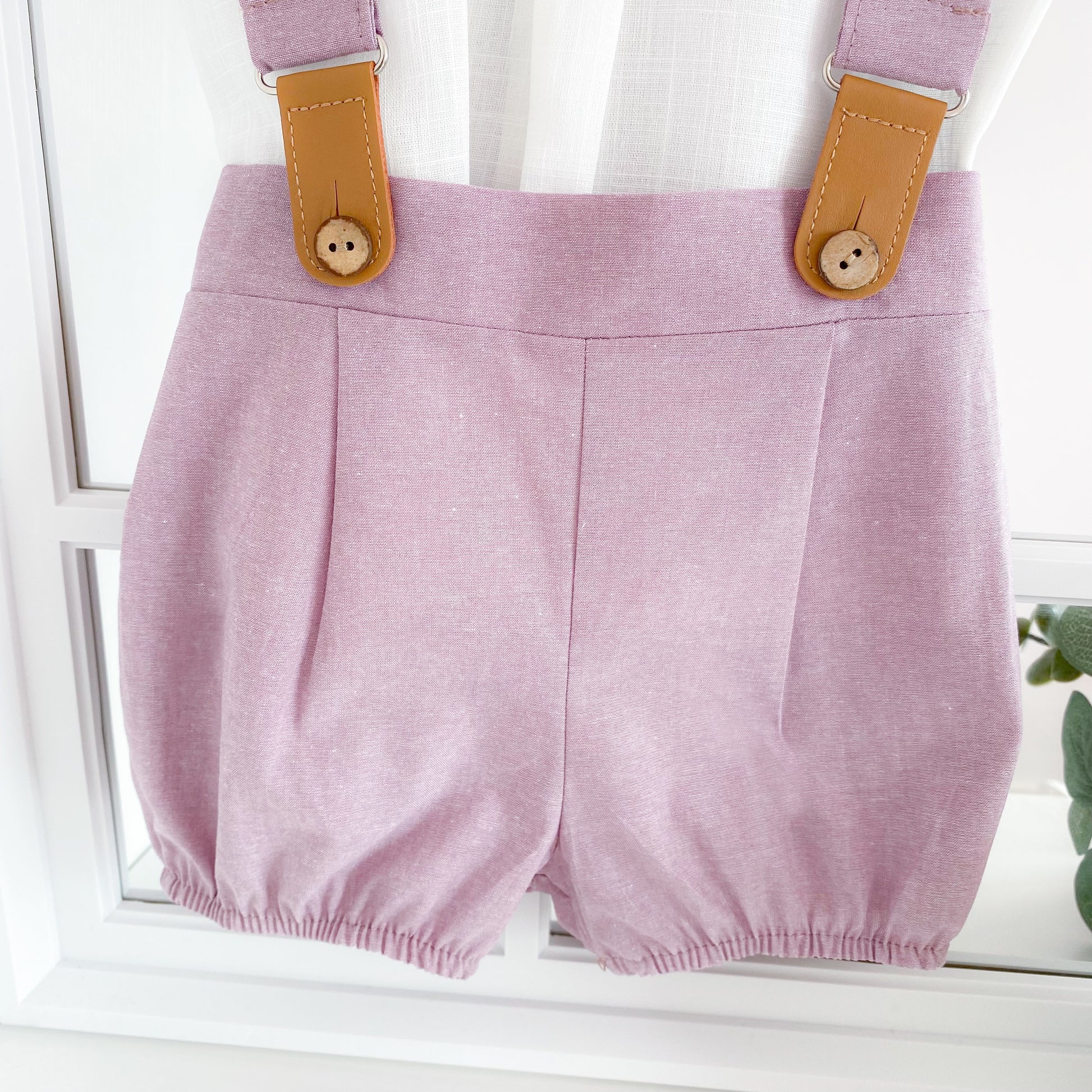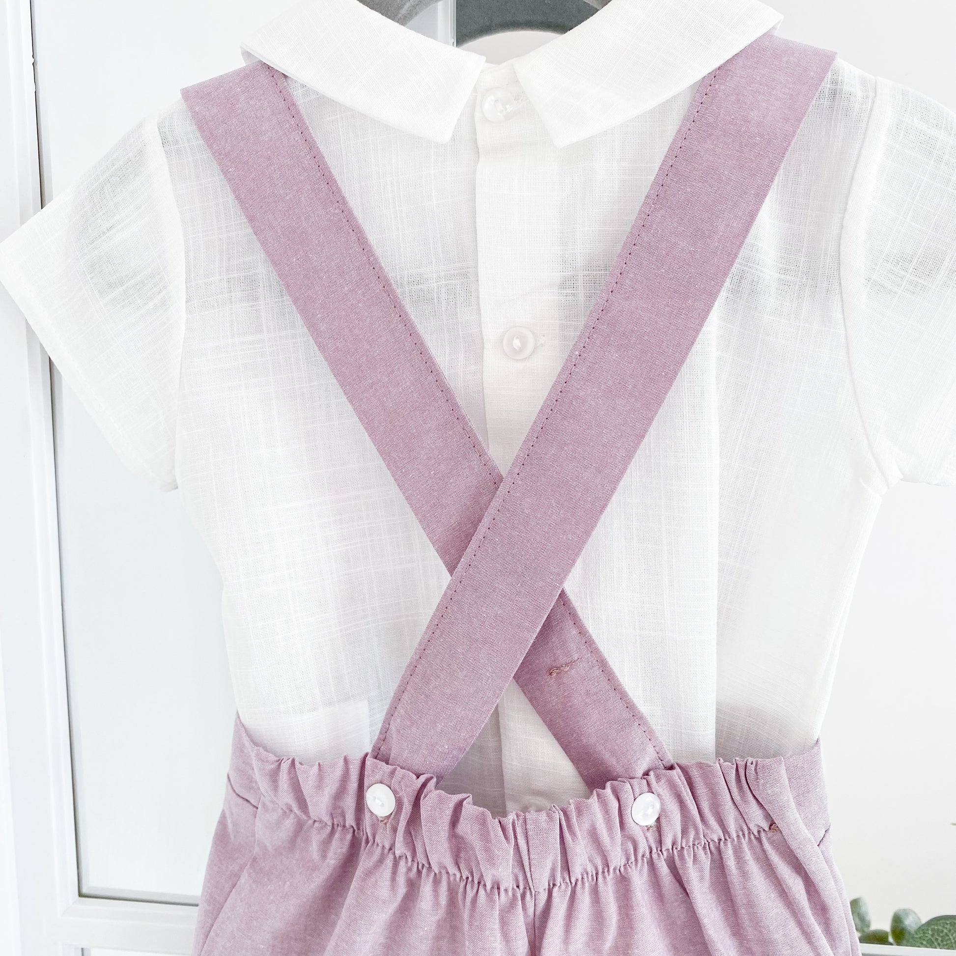 Adorable ivory linen short sleeve collared shirt with mock buttons, and shorts featuring detachable braces.
